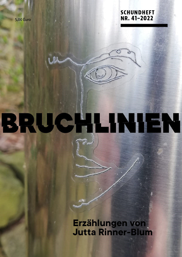 Die bekannte Erzählerin Jutta Rinner-Blum hat mit dem Schundheft Nr. 41 der literarischen Reihe von unartproduktion fünf Erzählungen vorgelegt, die in die Tiefen und Untiefen von Beziehungen hineinleuchten. In ihrem besonderen Erzählstil begegnen wir in der ersten Geschichte „Rosie und Josie“, in der sie den Weg zur „Marterhütte“ weist und eine Beziehung ihren unaufhaltbaren Lauf nimmt. In „Gustav heißt Mustafa“ deutet sich bereits im Titel die Bruchlinie einer Beziehung an, ebenso wie in „Fatma“, der nächsten Erzählung. „In den Himmel fallen will ich ins Blau und wieder atmen“ sagt sie und entgegnet ihrer Mutter: „Wie oft muss ich dir noch sagen, dass ich keinen Mann will? Und einen türkischen schon gar nicht!“ Jutta Rinner-Blum erweist sich in „Joe‘s Welten“ als genaue Beobachterin von Joe, der stundenlang zu Hause auf der Treppe sitzt und redet. Mit Ines oder mit jemandem, der zufällig vorbeikommt. Die titelgebende Erzählung „Bruchlinien“ folgt als letzte im neuen Schundheft.